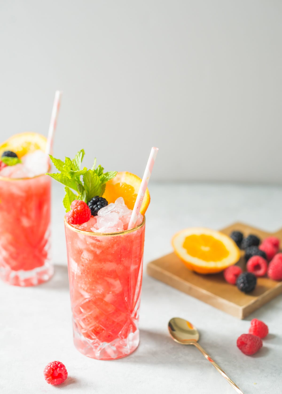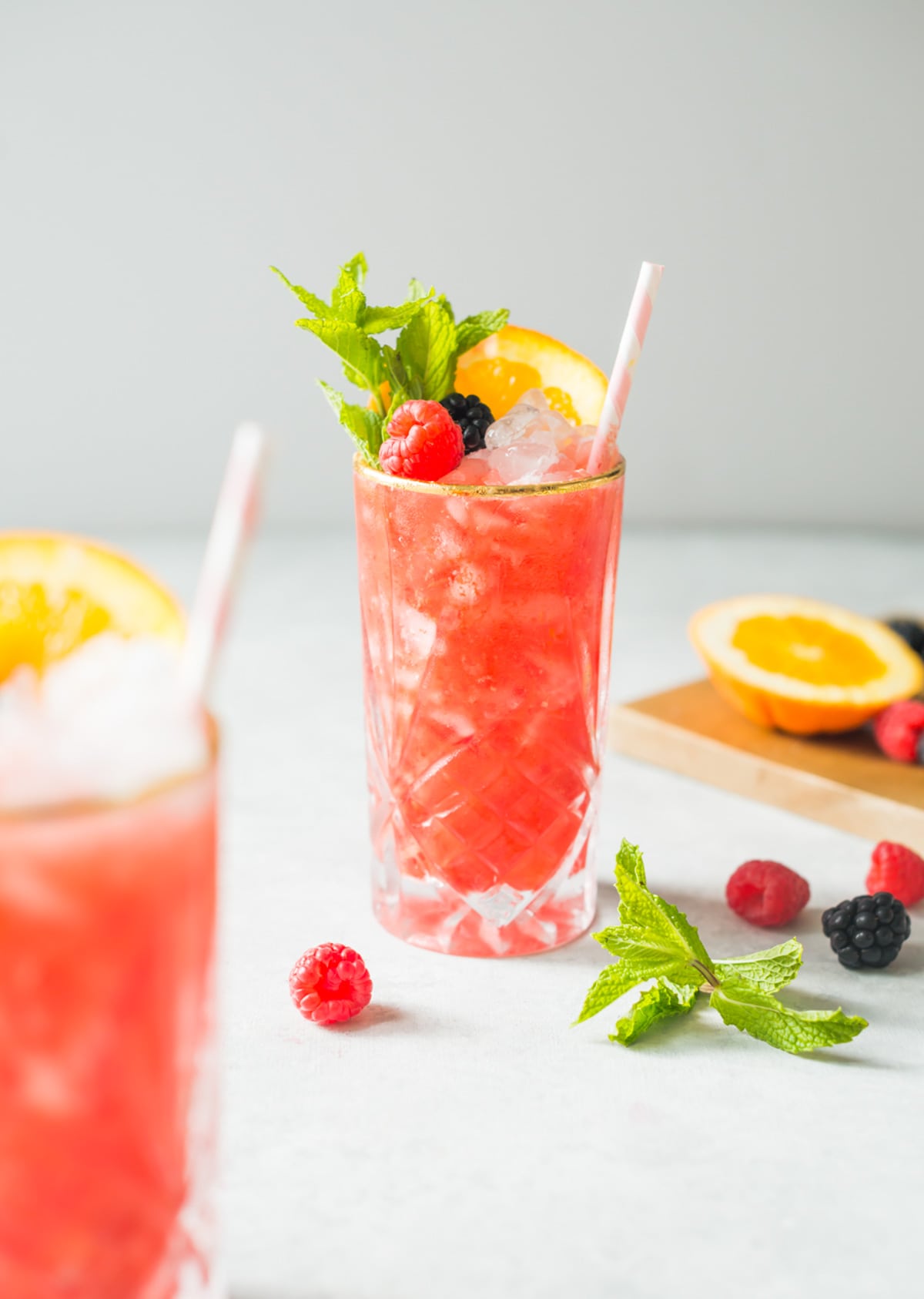 - Garnish with orange wheel, berries & mint.