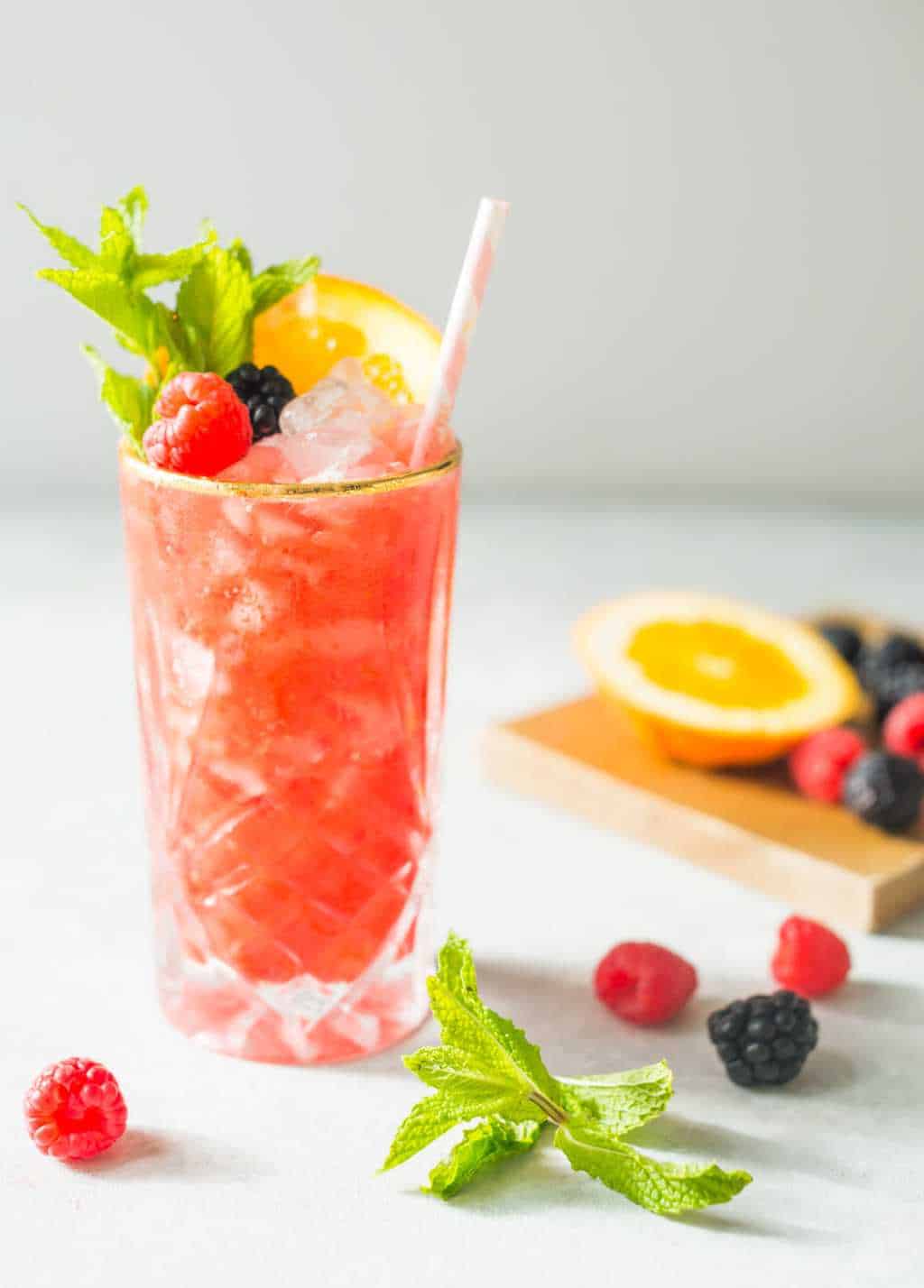 It has raspberries, blackberries, and strawberries that are muddled to give this ruby-hued drink a sweet-tart bite.